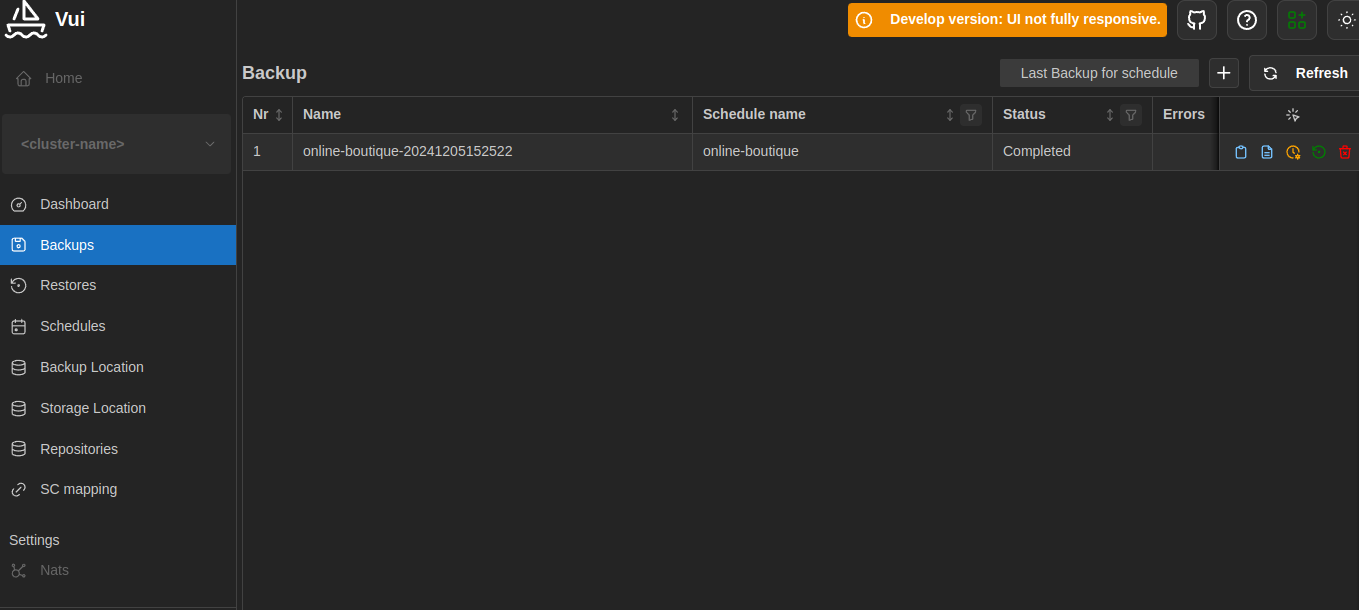 Section titled “Velero backups”Velero enables you to back up your application’s configuration and resources. To automate backups, set up a Schedule that defines the interval between each backup.